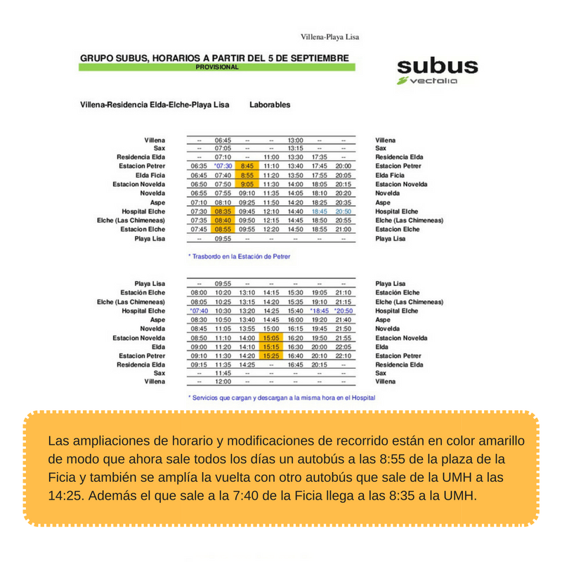 Concretamente solicitaban un autobús más por las mañanas ya que hasta ahora sólo había servicio a las 7:30 y a las 11:10 desde la estación de Petrer que también tiene parada en la plaza de la Ficia. Subús, atendiendo a la petición ha puesto una nueva salida a las 8:45. Otra de las quejas es que la línea tardaba mucho en llegar a la UMH, de modo que Subús ha cambiado el recorrido con el fin de llegar antes de las 9 a la Estación de Autobuses (parada de la UMH).
