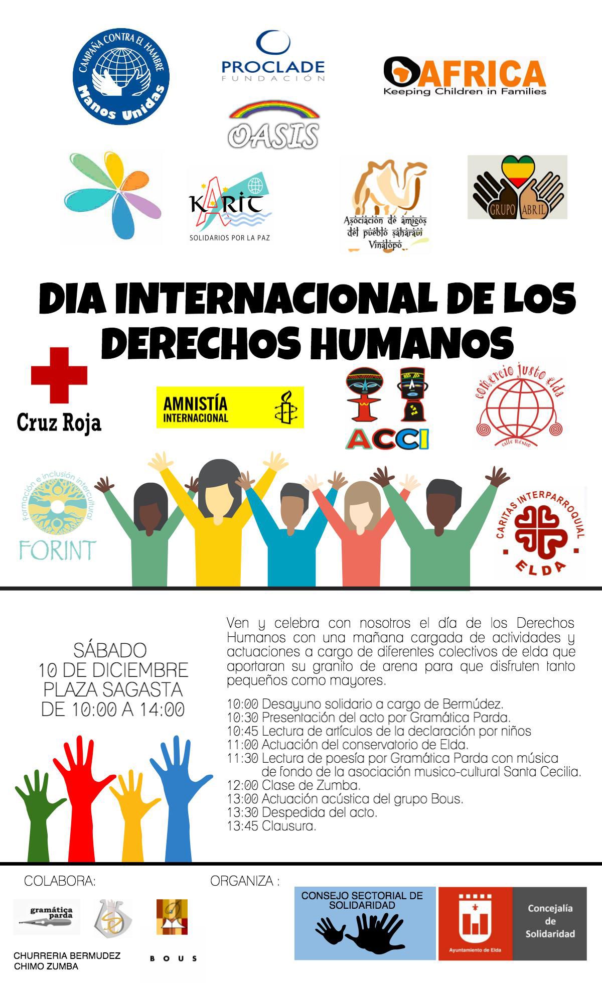 El próximo sábado 10 de diciembre, con motivo del día de los Derechos Humanos, el Ayuntamiento, junto con el Consejo de Solidaridad, ha preparado una mañana cargada de actividades y actuaciones a cargo de diferentes colectivos de Elda que aportaran su granito de arena para celebrar este día y que disfruten tanto pequeños como mayores.