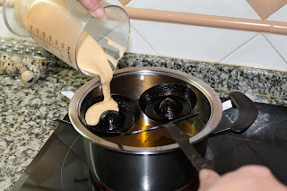Comprobamos con un poco de masa la temperatura del aceite, y empezamos a freír rellenando el molde , el cual sumergimos en el aceite.