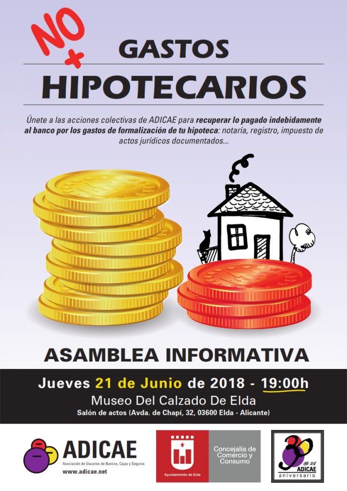 Para informar de los pasos que hay que dar para beneficiarse de esta medida a raíz de una sentencia judicial y resolver cualquier duda en persona, ADICAE está celebrando asambleas informativas abiertas al público. En Elda será este jueves por la tarde en el Museo del Calzado, tal y como ha informado la Oficina Municipal de Información al Consumidor (OMIC)..