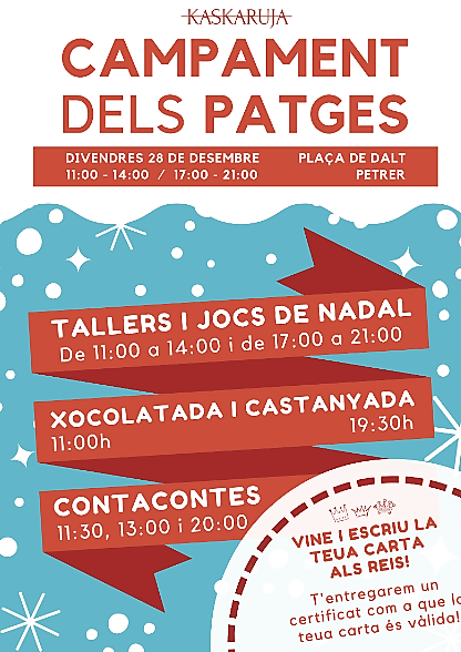 VIERNES 28 DICIEMBRE CAMPAMENTO DE LOS PAJES – PLAÇA DE DALT – PETRER – ACTIVIDAD ORGANIZADA Y GESTIONADA POR KASKARUJA 11:00-14:00 y 17:00 -21:00