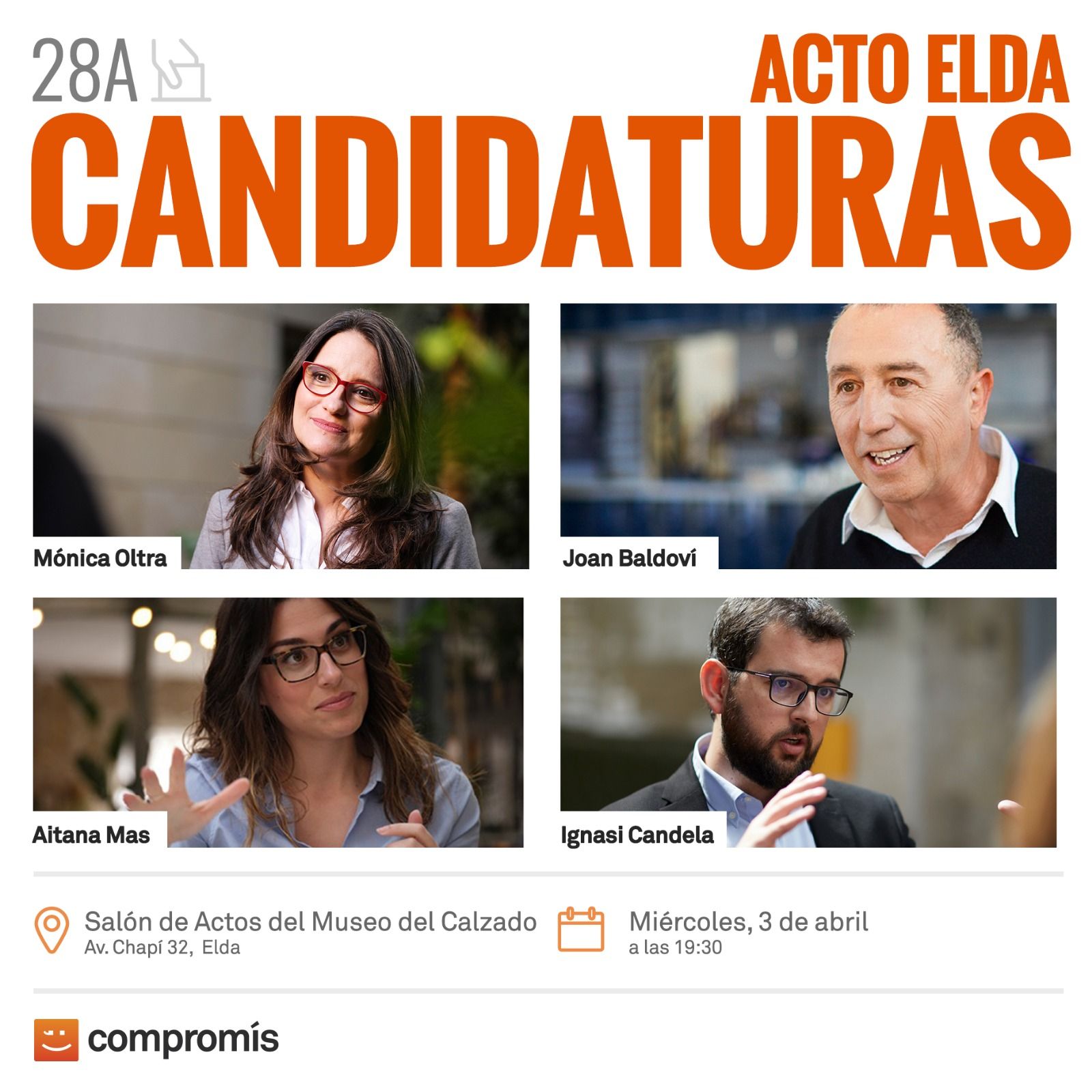 Mónica Oltra y Joan Baldoví, vicepresidenta y portavoz de Compromís, estarán en Elda el próximo 3 de abril, en un acto de presentación de los líderes del partido, para las próximas elecciones nacionales, autonómicas y municipales.