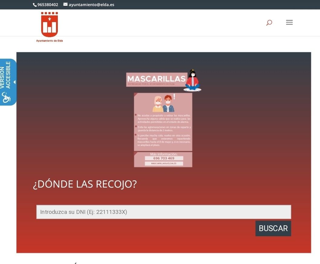 Los vecinos y vecinas de Elda pueden conocer ya en la web del Ayuntamiento (www.elda.es/reparto-mascarillas-higienicas) el punto al que deben acercarse para conseguir su mascarilla, introduciendo el DNI del adulto responsable de recoger las mascarillas. Además, para dudas o información adicional sobre el reparto se ha habilitado el teléfono 696703469 y el correo electrónico mascarillas@elda.es .