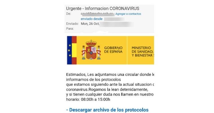 El Ministerio de Sanidad informa de que se ha detectado una campaña de envío masivo de correos electrónicos maliciosos que intentan suplantar la identidad del Ministerio de Sanidad mediante la duplicación de la imagen corporativa y el uso de dominios de correo inexistentes, como @mscbs.gob.es. Estos correos contienen información relacionada con términos como el coronavirus, la COVID-19, Estado de Alarma y otros.