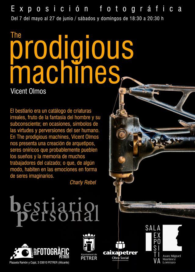 El próximo viernes 7 de mayo a las 19:30 tendrá lugar en la sala expositiva Juan Miguel Martínez Lorenzo en la sede del Grup Fotogràfic de Petrer (GFP) la inauguración de la exposición fotográfica “The prodigious machines”, a cargo de nuestro vicepresidente Vicent Olmos.
