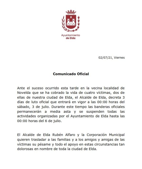 Ante el suceso ocurrido esta tarde en la vecina localidad de Novelda que se ha cobrado la vida de cuatro víctimas, dos de ellas de nuestra ciudad de Elda, el Alcalde de Elda, decreta 3 días de luto oficial que entrará en vigor a las 00:00 horas del sábado, 3 de julio. Durante este tiempo las banderas oficiales permanecerán a media asta y se suspenden todas las actividades organizadas por el Ayuntamiento de Elda hasta las 00:00 horas del 6 de julio.