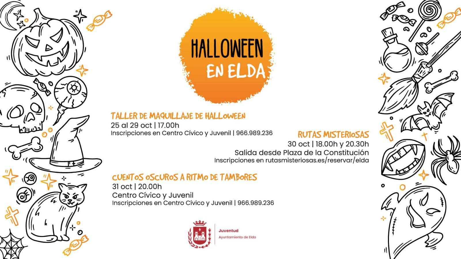 La concejala de Juventud, Anabel García, ha dado a conocer los detalles de una programación que arrancará “el 25 de octubre con el Taller de Maquillaje de Halloween, que se prolongará en el Centro Cívico hasta el día 29 de octubre de 17.00 a 18.00 horas. Las inscripciones se podrán realizar en el Centro Cívico, llamando por teléfono al 966 989 236 de lunes a viernes, de 9.00 a 14.00 horas”.