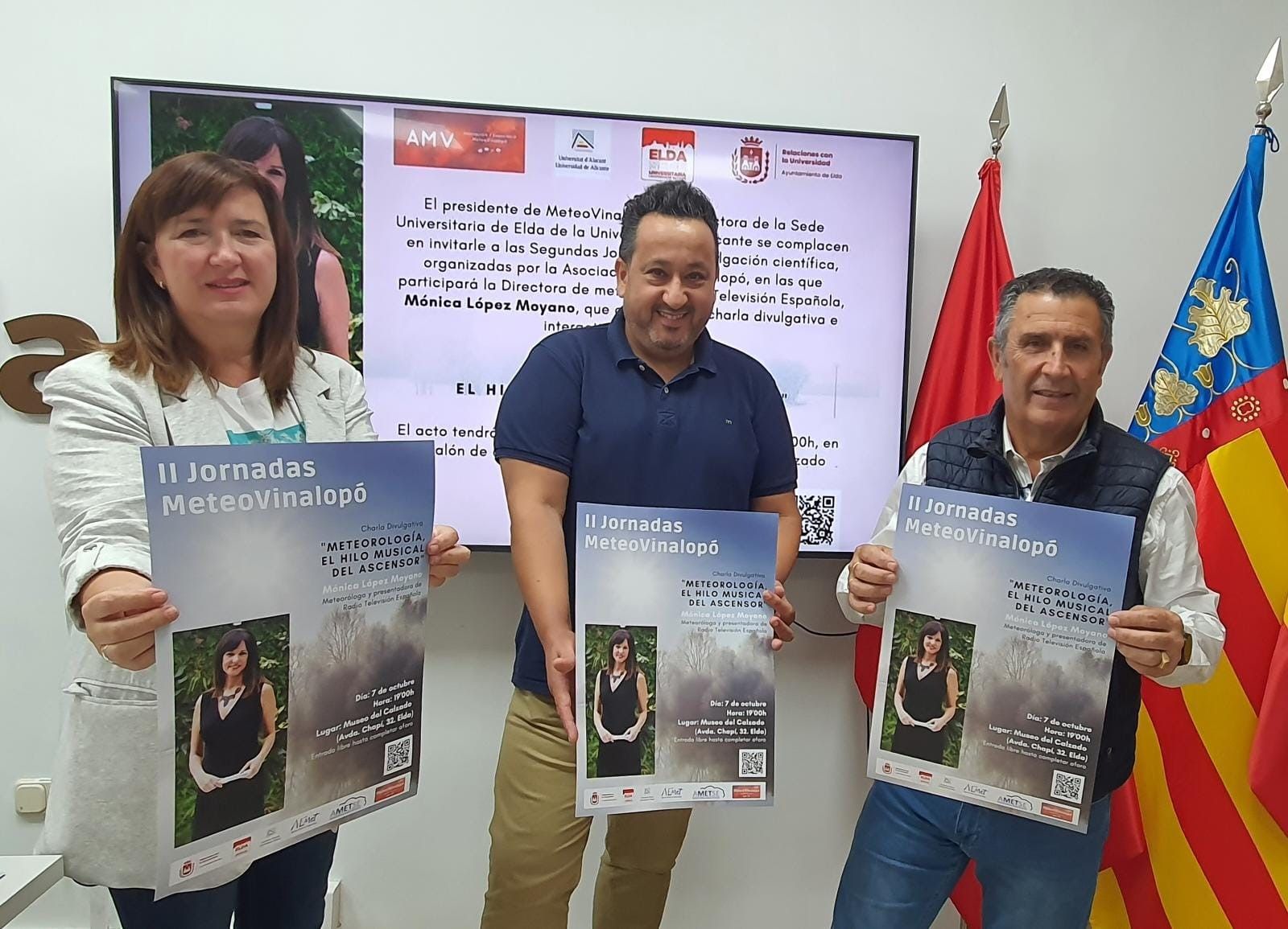 El edil del área, Amado Navalón, acompañado del presidente de MeteoVinalopó, Lluis Francés, y la directora de la Sede Universitaria de Elda, Rosario Navalón, ha dado a conocer los detalles de “una interesante propuesta de divulgación científica. Se trata de hablar de algo tan cotidiano como es el tiempo y conocer cómo se hacen las predicciones meteorológica”.