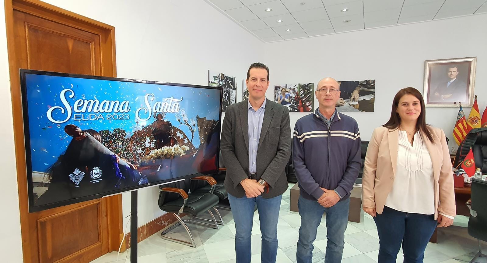 El alcalde de Elda, Rubén Alfaro, acompañado por la concejala de Fiestas, Lorena Pedrero, y el presidente de la Junta Mayor de Cofradías de Elda, José Pascual, ha presentado esta mañana el vídeo promocional de la Semana Santa eldense 2023. El vídeo, realizado por Candi Navarro, servirá para difundir la celebración en Elda y animar a los y las eldenses y a los visitantes a disfrutar de las fiestas.