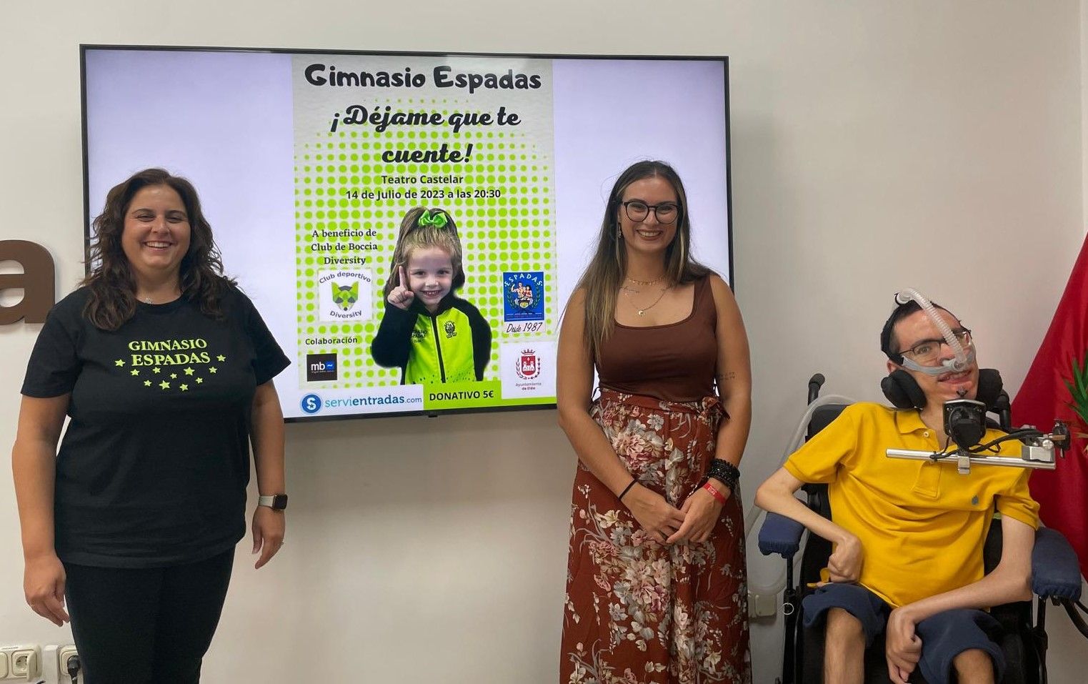 11 de julio de 2023.- El Teatro Castelar acoge el próximo viernes, 14 de julio, a partir de las 20.30 horas, la gala benéfica ‘¡Déjame que te cuente!’ que el Gimnasio Espadas, en colaboración con el Ayuntamiento de Elda, organiza a favor del Club de Boccia Diversity. El evento ha sido presentado esta mañana por la concejala de Deportes, María Gisbert, que ha estado acompañada por Sonia Espadas, representante del Gimnasio Espadas de Elda, y Miguel Ángel Mira, presidente del Club de Boccia Diversity.