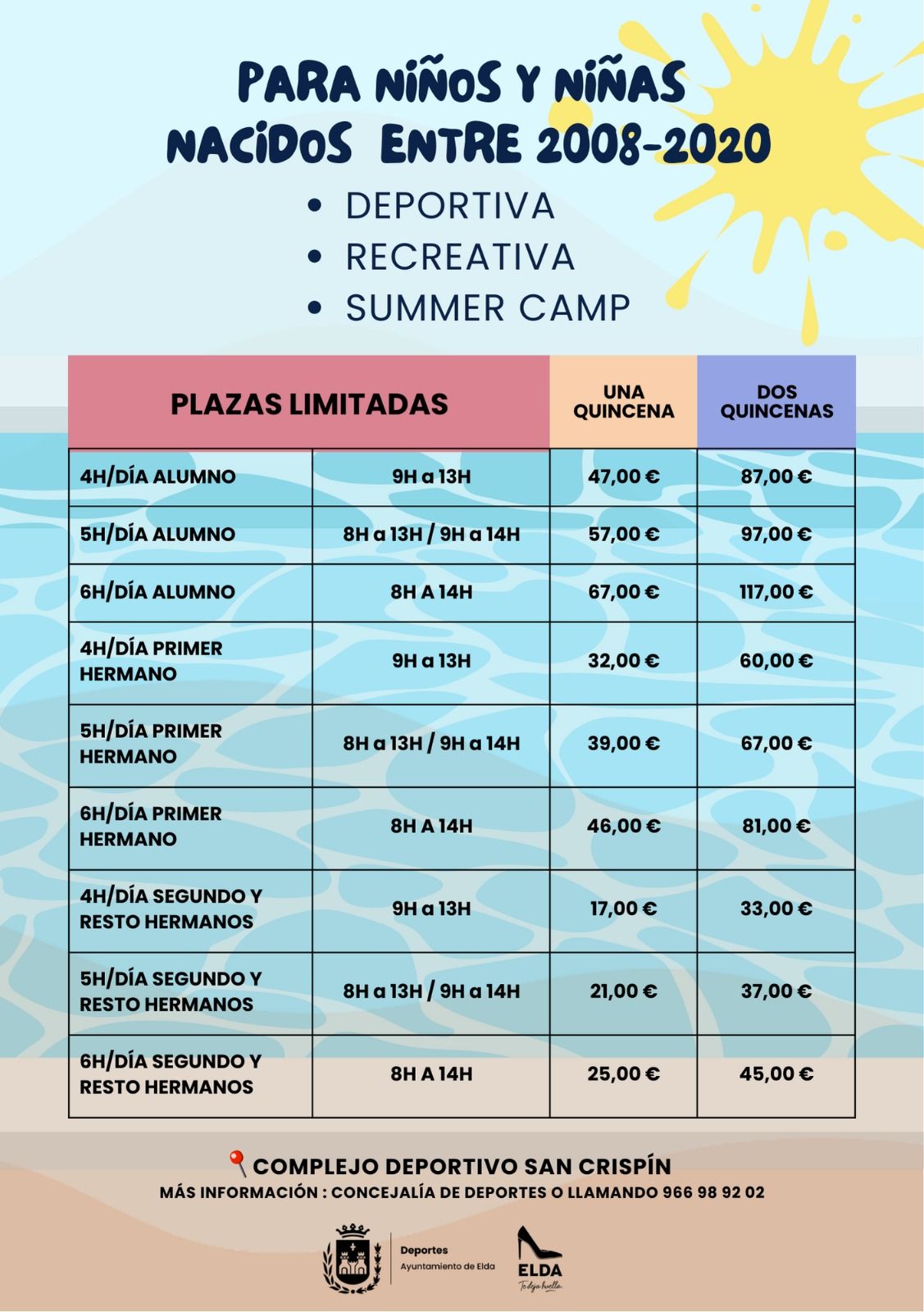 La inscripción se podrá realizar hasta el 12 de mayo en la página web www.deportes.elda.es. Las primeras inscripciones van destinadas para las niñas y niños empadronados en Elda, abriéndose el 27 de mayo la inscripción libre para todas aquellas plazas disponibles.