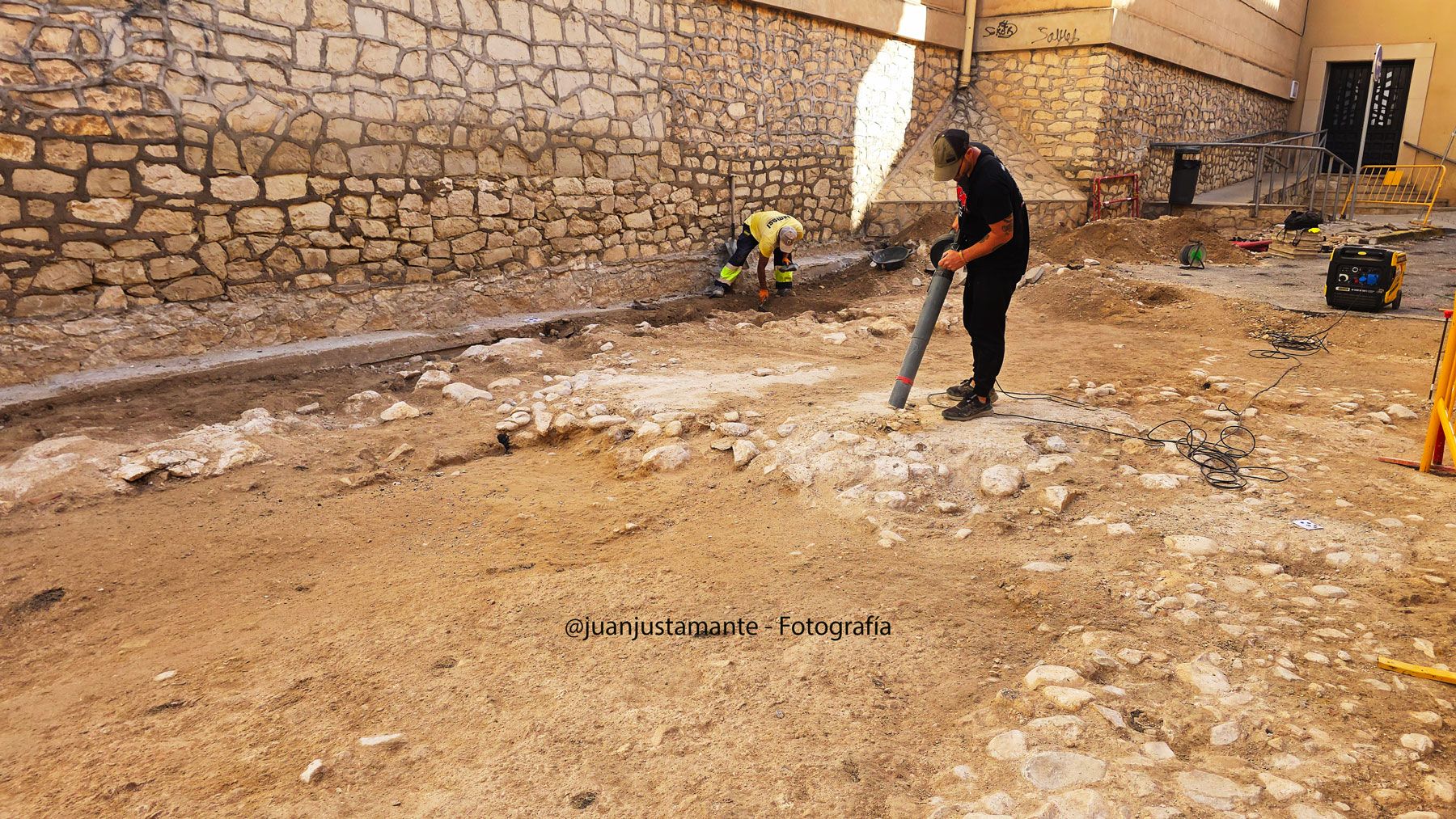 Los trabajos han revelado los cimientos de la antigua iglesia, que fue destruida en 1936, incluyendo la base de su única torre, la capilla del Cristo.