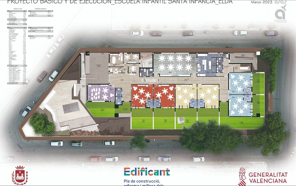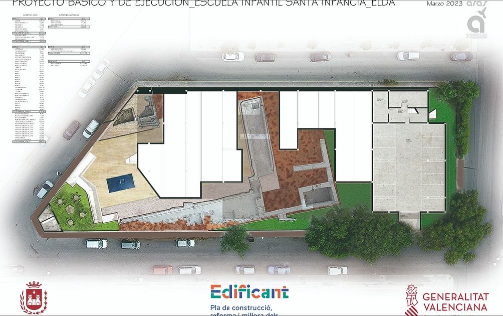 Con un plazo estimado de ejecución de 16 meses, el proyecto de la nueva Escuela Infantil Santa Infancia cuenta con un presupuesto total de 2.818.623 euros, lo que supone un incremento de más de 732.000 euros respecto al presupuesto inicial. Este aumento responde a la necesidad de acometer actuaciones arqueológicas adicionales ya que la parcela donde se levantará el nuevo centro corresponde al antiguo convento franciscano fundado en el siglo XVI por el primer Conde de Elda. Cabe recordar al respecto que durante las excavaciones se documentaron e identificaron diversos espacios del antiguo convento, unos restos de gran valor histórico y patrimonial.