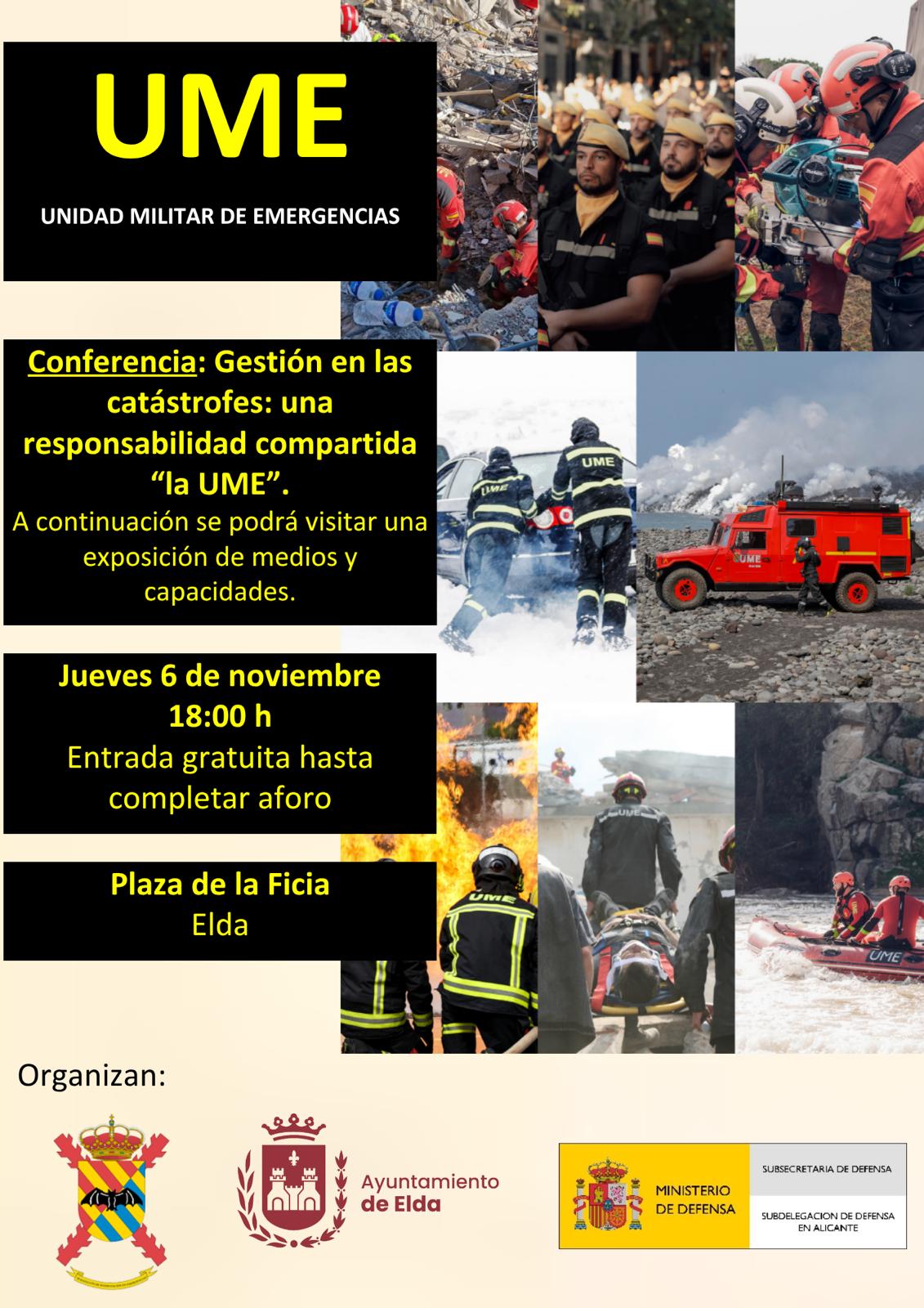 La exhibición de material dará comienzo por la mañana, de 9.00 a 13.00 horas, franja horaria en la que también asistirán los alumnos y alumnas de centros educativos de Elda que han mostrado su interés. A las 10.00 horas, los mandos de la UME ofrecerán en el salón de actos del Centro Cívico una charla al alumnado del Grado de Seguridad y Medio Ambiente del CIPFP Valle de Elda. Por la tarde, la exhibición estará abierta de 16.00 a 18.00 horas. Además de exhibir los medios materiales, los mandos de la UME ofrecerán a las 18:00 horas una conferencia abierta a todo el público sobre la gestión en las catástrofes. Tendrá lugar en el salón de actos del Centro Cívico y Juvenil, con entrada libre hasta completar el aforo.