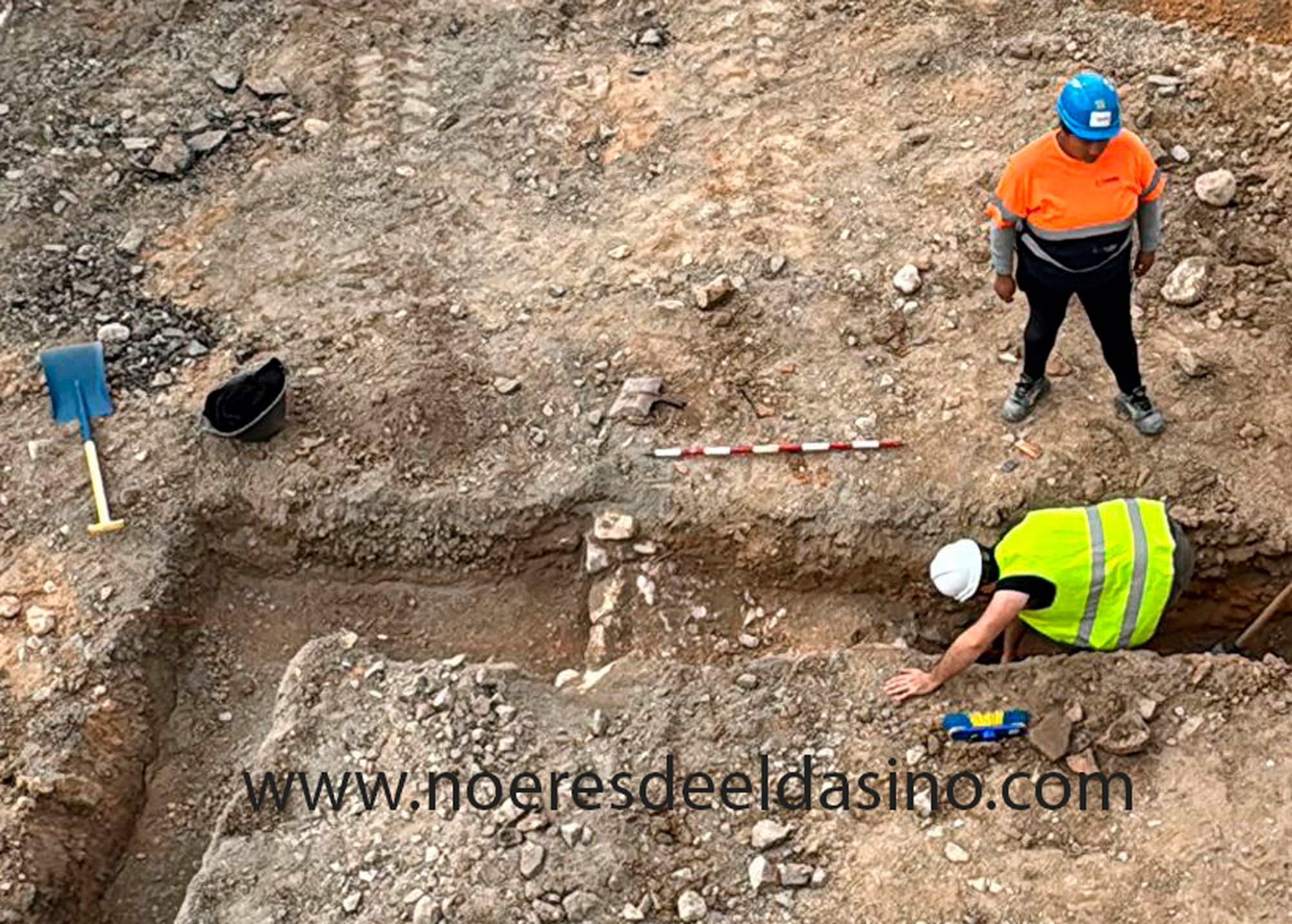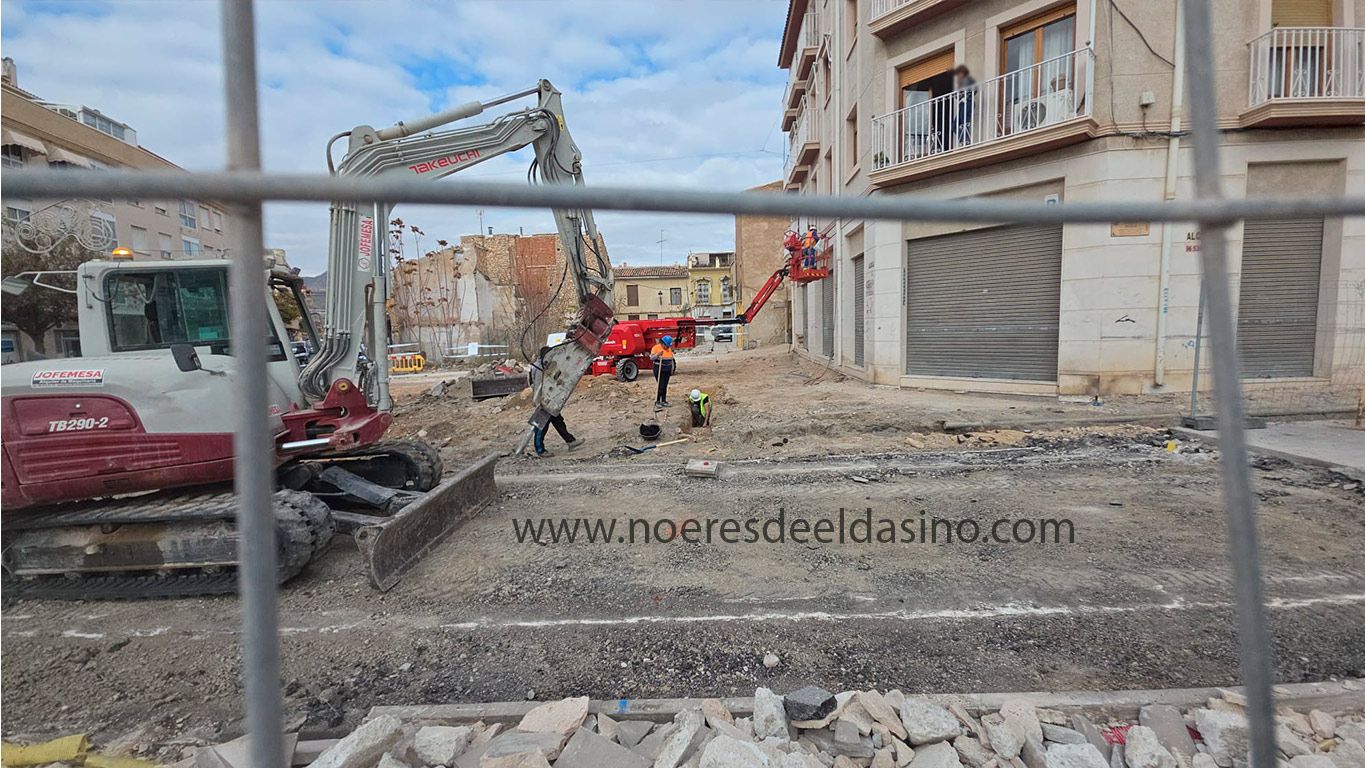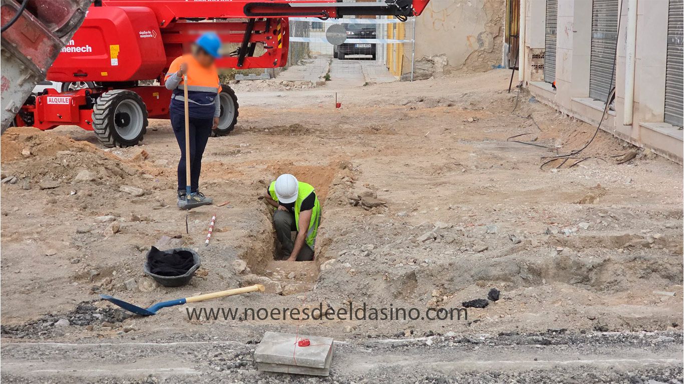 Elda, 12/12/2025 Las obras de remodelación de la plaza en la confluencia de la Calle Nueva con San José de Calasanz han tomado un giro inesperado. Apenas han empezado las obras, el equipo de excavación ha descubierto unos restos de mampostería, podría tratarse de los cimientos de una antigua edificación civil o, incluso, parte de las infraestructuras históricas de la zona de amurallamiento de Elda antigua.